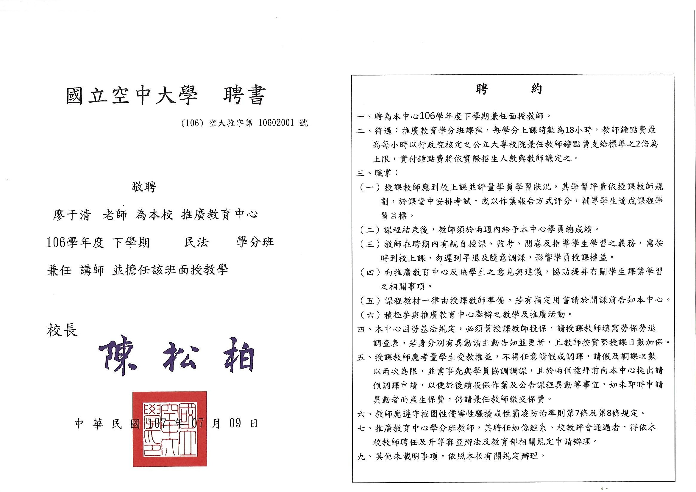 20 7 月 0 Comments Share Facebook Twitter LinkedIn 【玉山榮譽】 恭賀 所長廖于清律師獲聘為國立空中大學講師 ! Posted by rab in 玉山消息 恭賀 本所所長廖于清律師備受國立空中教育大學師生肯定,獲聘為106年度下學期民法學分班兼任講師並擔任該班面授教學。