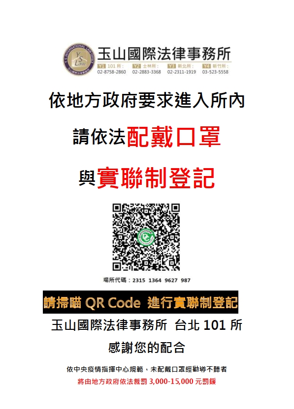 18 5 月 0 Comments Share Facebook Twitter LinkedIn 各位親愛的客戶您好: 為維護您的健康安全,本所配合中央實施實聯制,入所時請掃描QR Code 玉山國際法律事務所關心您! Posted by rab in 稅務法規