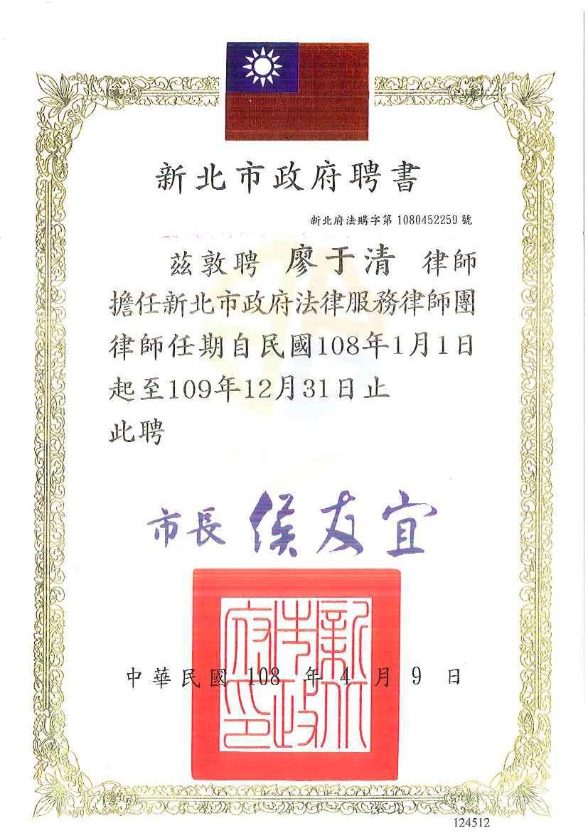 19 8 月 0 Comments Share Facebook Twitter LinkedIn 賀本所廖所長于清律師獲聘為108年度新北市政府法律服務律師團律師 Posted by rab in 玉山消息